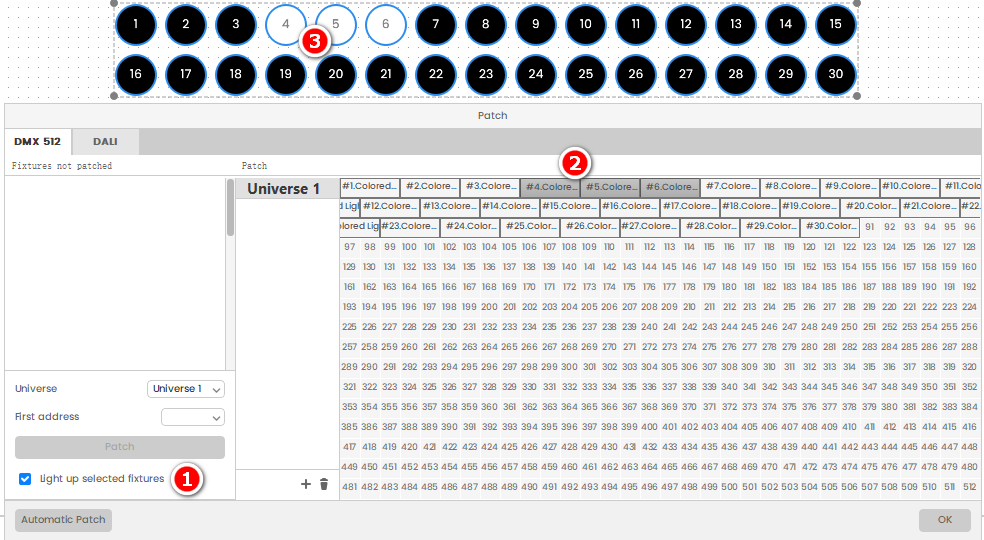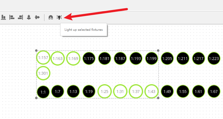 在软件的Builder界面,激活布灯图工作栏的【Light up selected fixtures】,单选或者框选RGB灯具,就可以直接点亮灯具。对于需要调整灯位,测试布灯图的正确性,将极为方便。