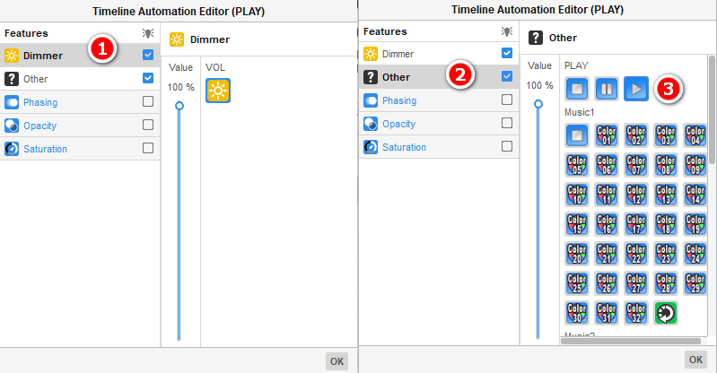 再次将 Basic block 拉到 DMX 音乐播放器上,并选择"Other" 选项,在列表中,选择这个场景对应的音乐文件夹和音乐文件即可。(01文件夹对应Music1, 02文件夹对应Music2,03文件夹对应Music3)